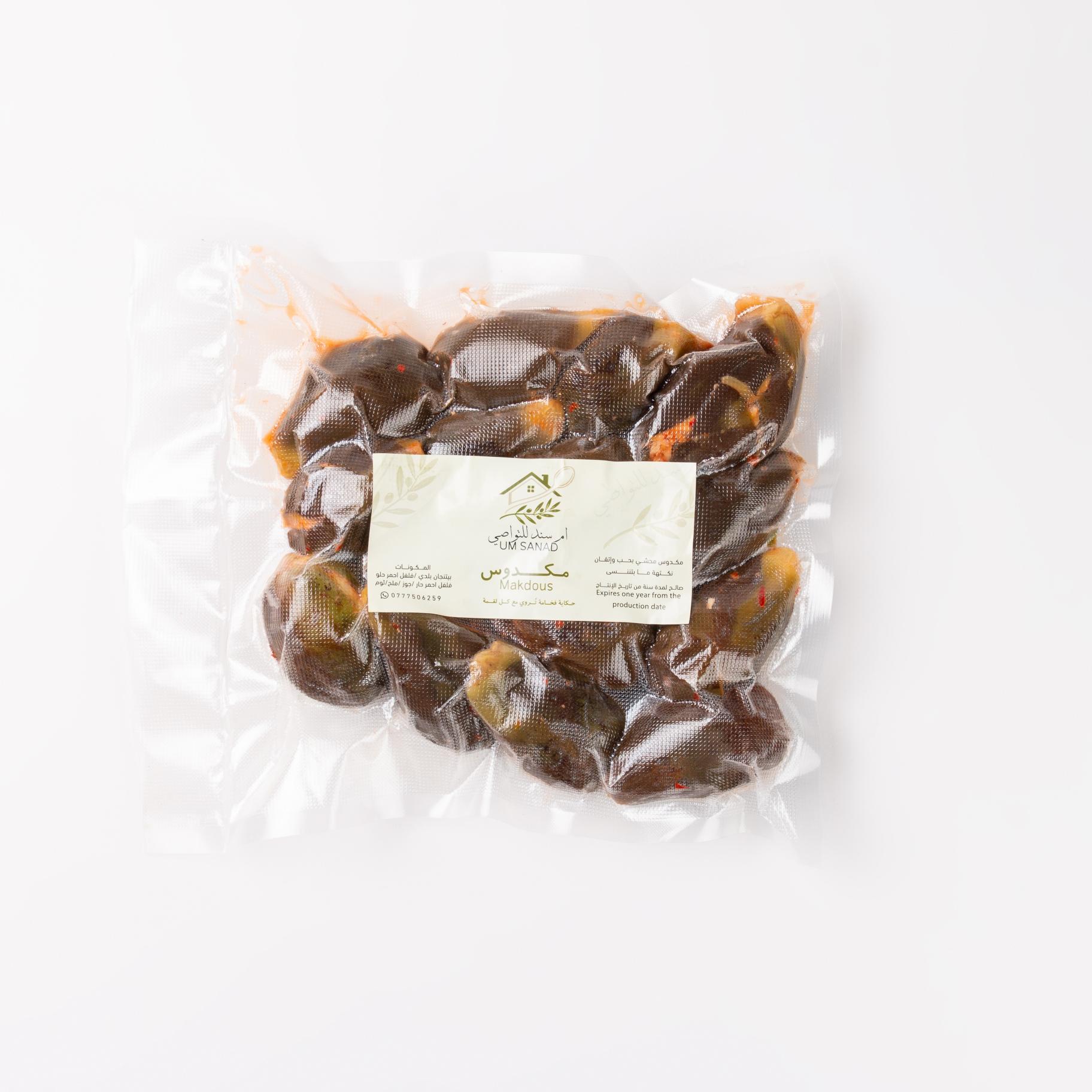 المكونات: باذنجان بلدي منتقى يدوياً، فلفل أحمر حلو وحار، جوز بلدي فاخر، ثوم، وملح.